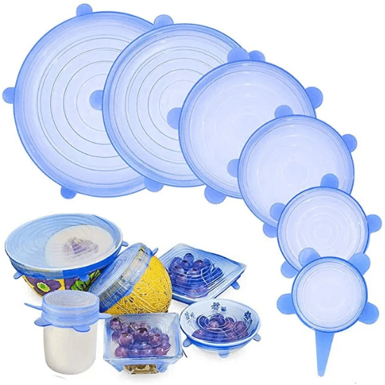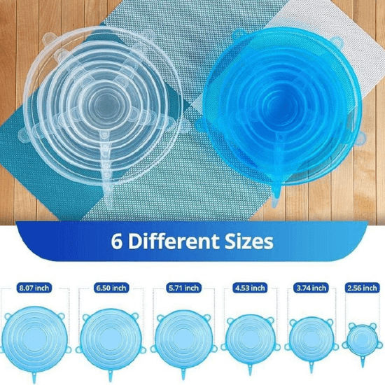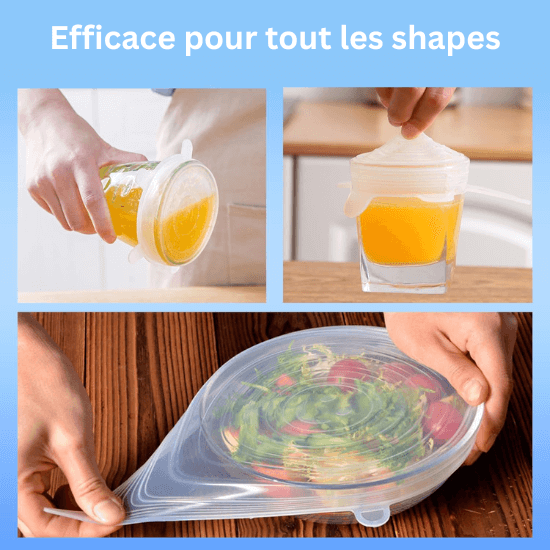 - 6 couvercles en silicone de tailles variées pour s’adapter à vos besoins quotidiens.